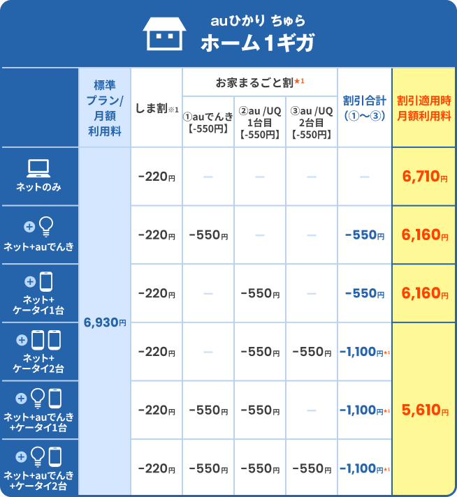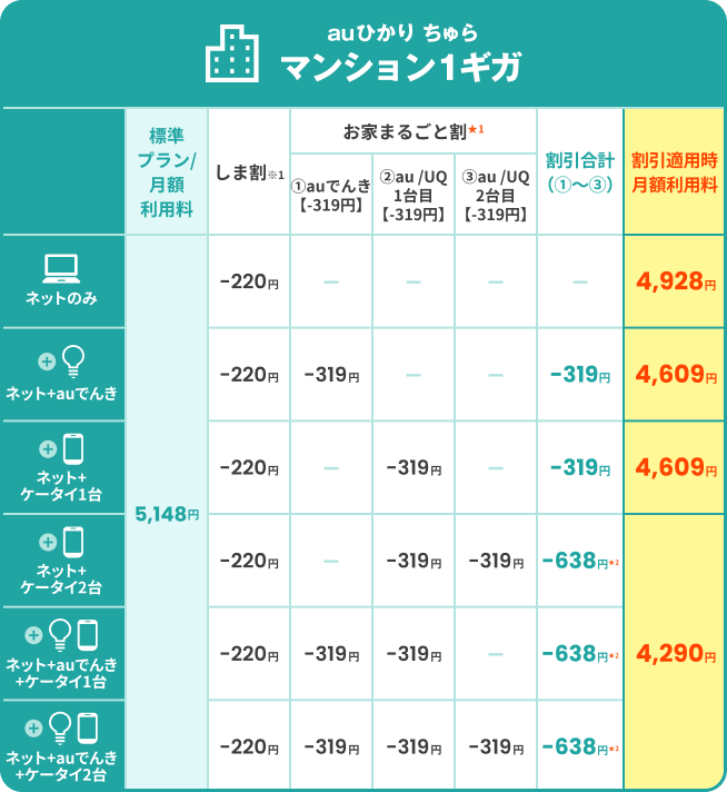 - auひかり ちゅらホーム1ギガ・マンションギガの標準プラン(各種割引適用前)との比較になります。