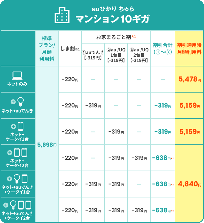 - 「ネット利用料割引」、「しま割」、「初期費用相当額割引(ネット)」、「口座振替/クレジットカード割引(110円/月割引」をすべて適用した場合の金額となります。